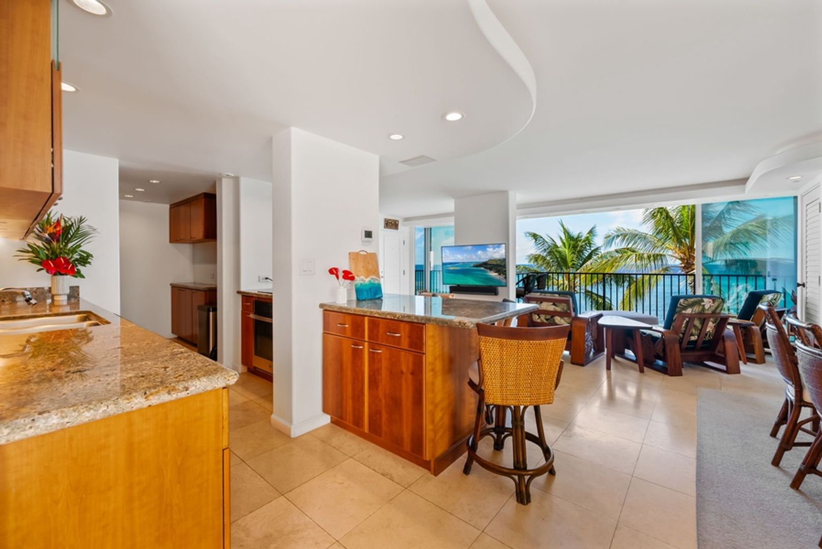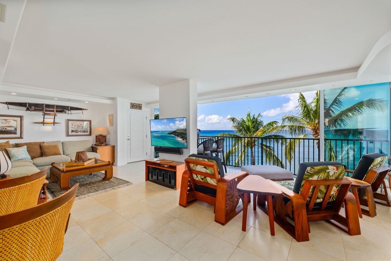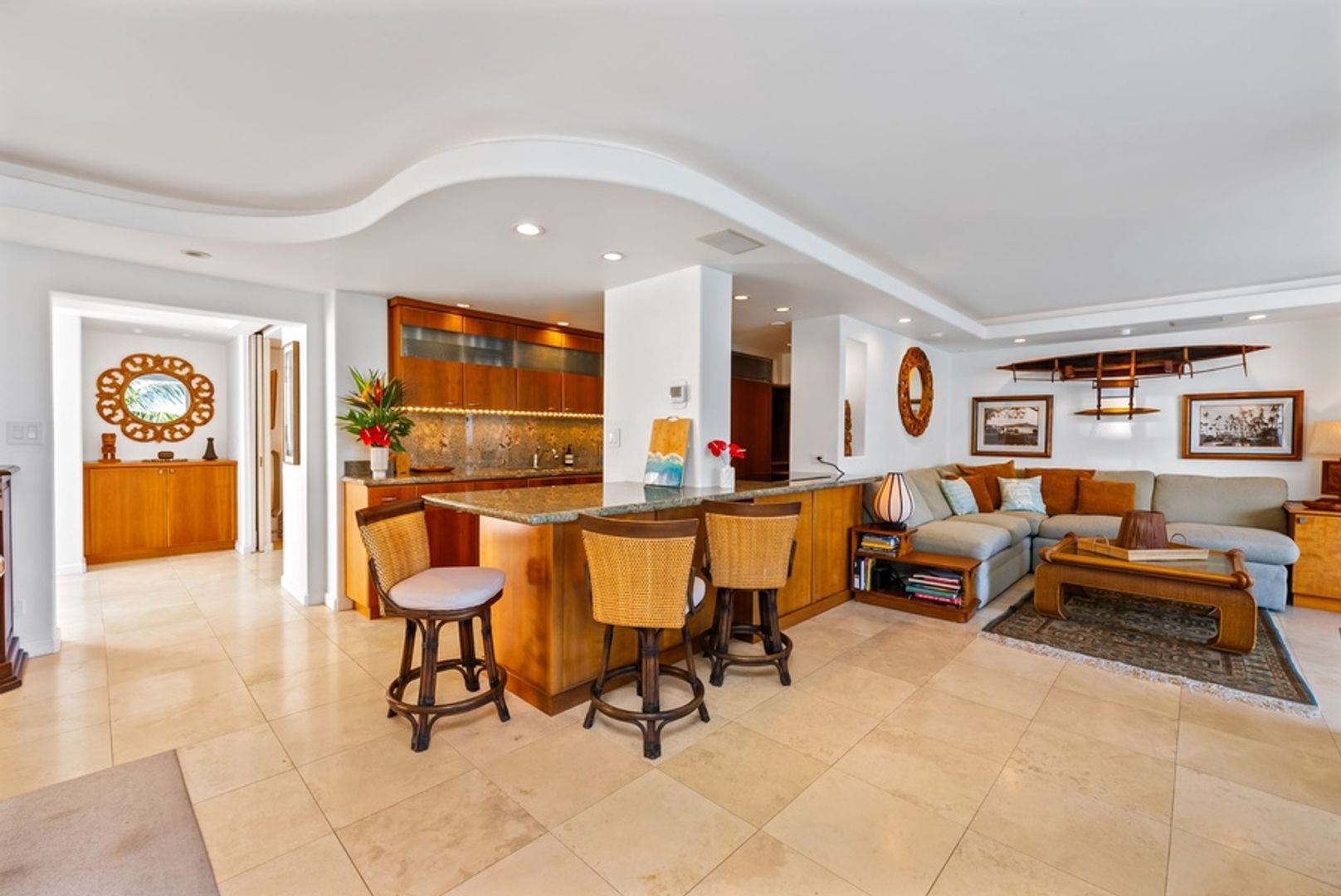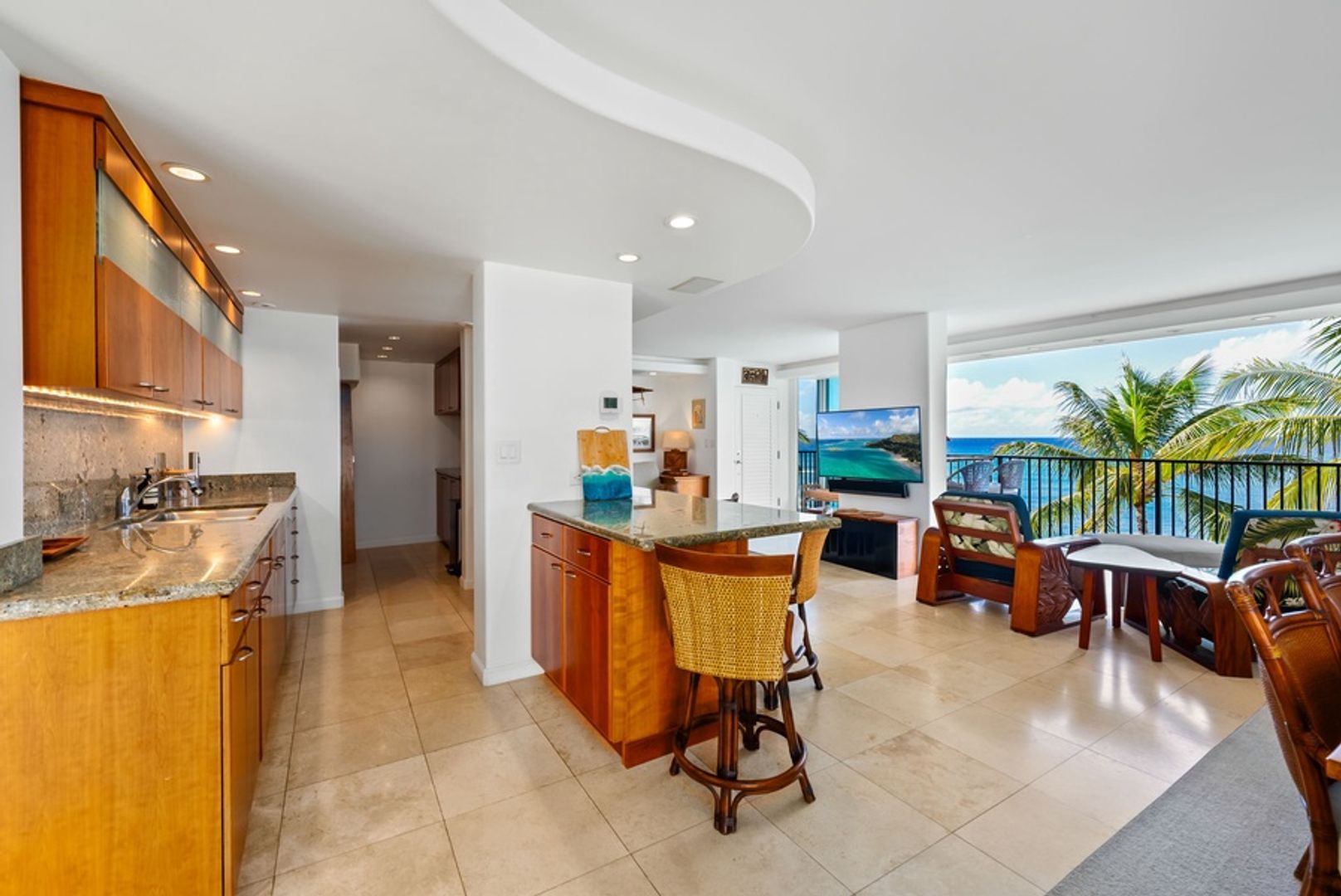 * Sophisticated Island Design: Dark wood accents and sandy tile floors echo the island’s contrasts, creating a refined and relaxing ambiance.