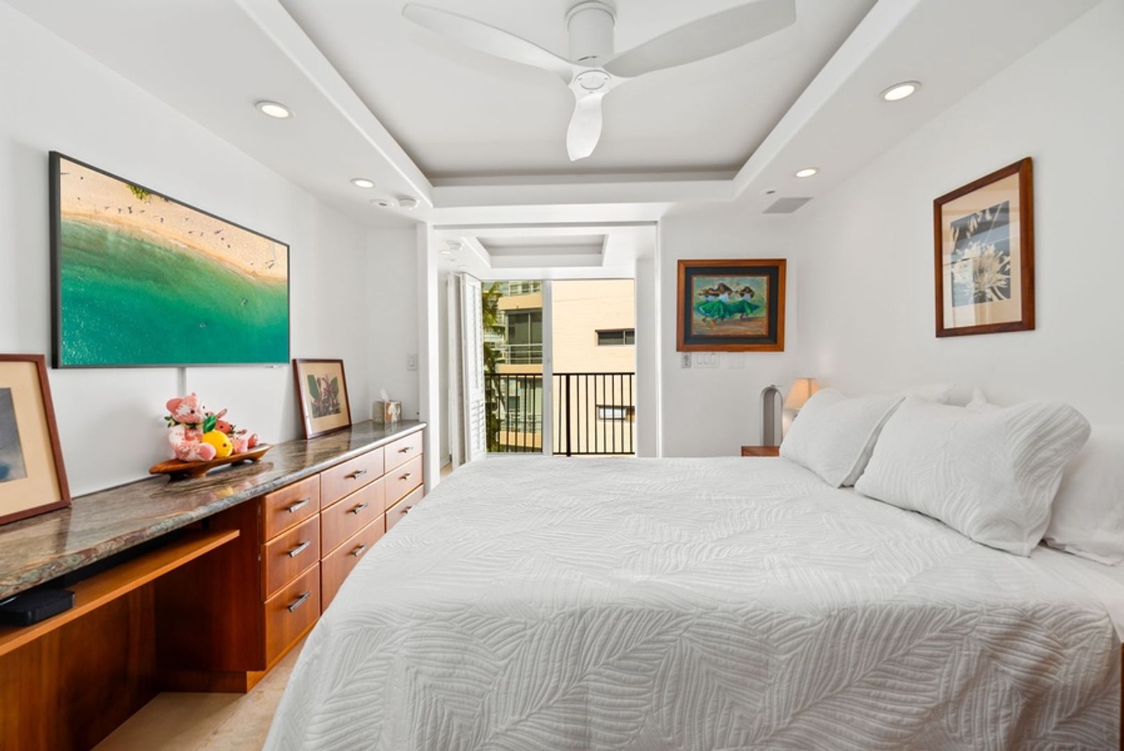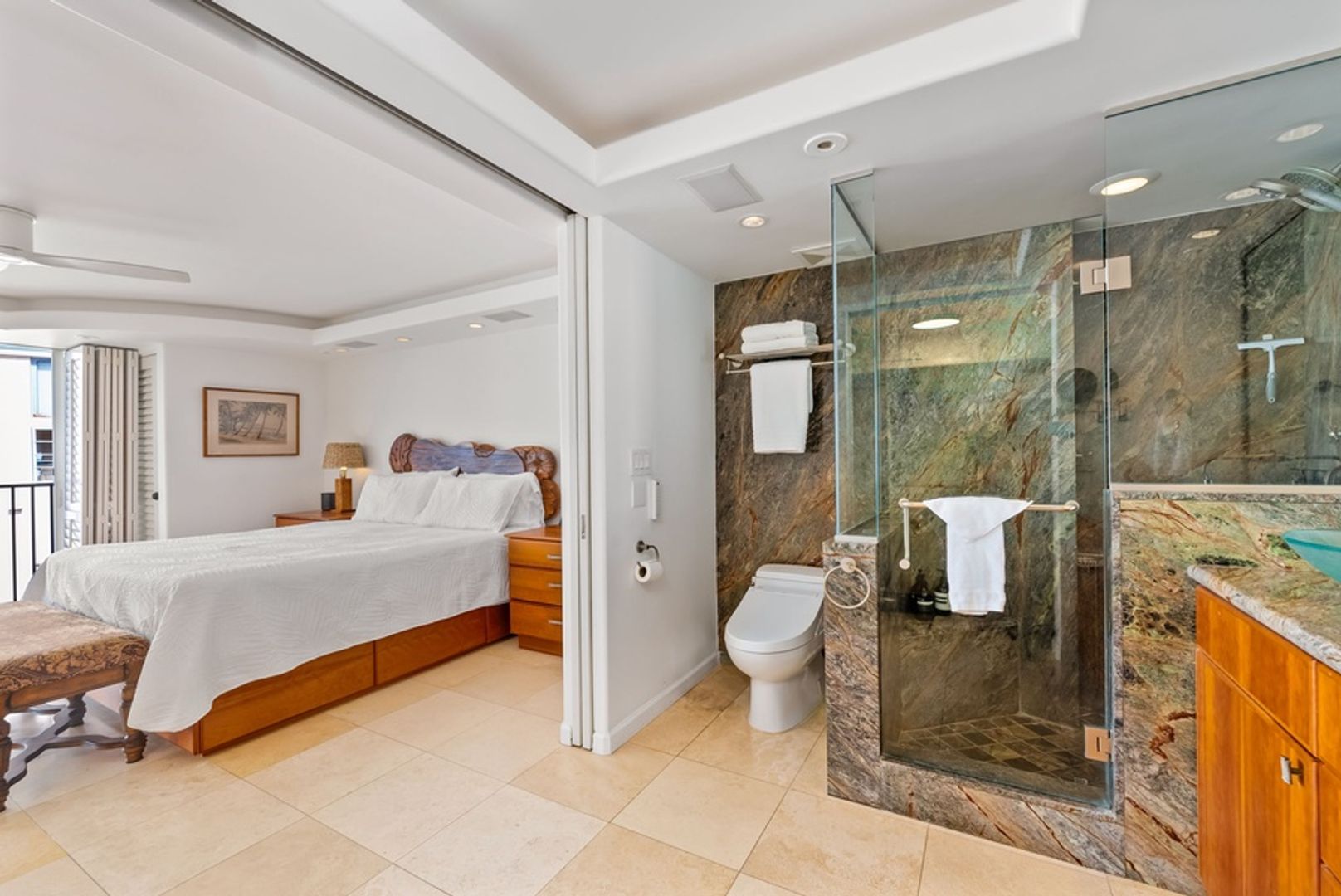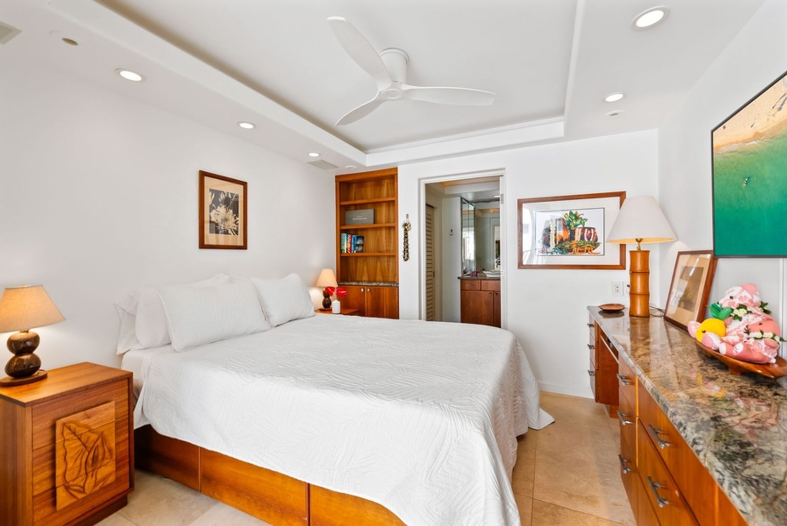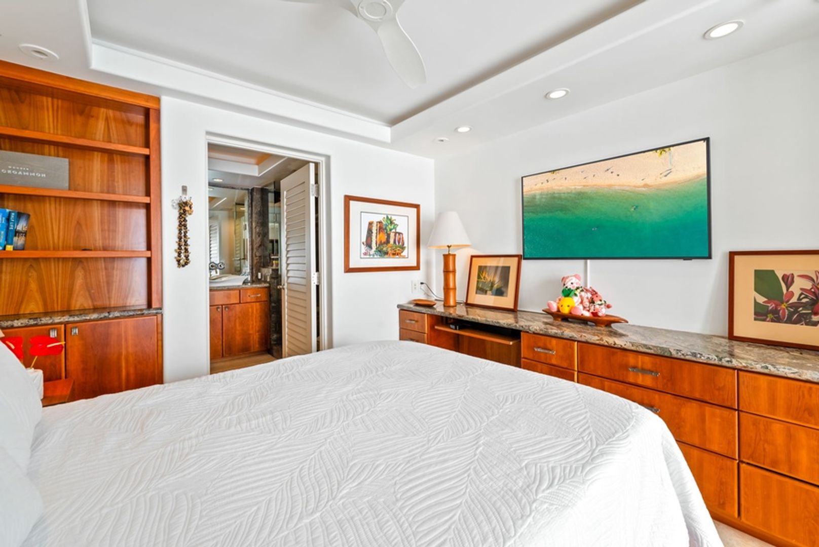 The primary suite features a California King bed and an ensuite bathroom with a walk-in shower. Begin each day with peaceful views and unwind in a setting designed for complete relaxation, equipped with a wall-mounted TV and ceiling fan. The second bedroom includes a comfortable Queen bed, TV, and its own private ensuite bathroom with a walk-in shower, providing additional privacy and convenience. Both bathrooms continue the condo’s sophisticated aesthetic, with granite countertops and high-end fixtures.