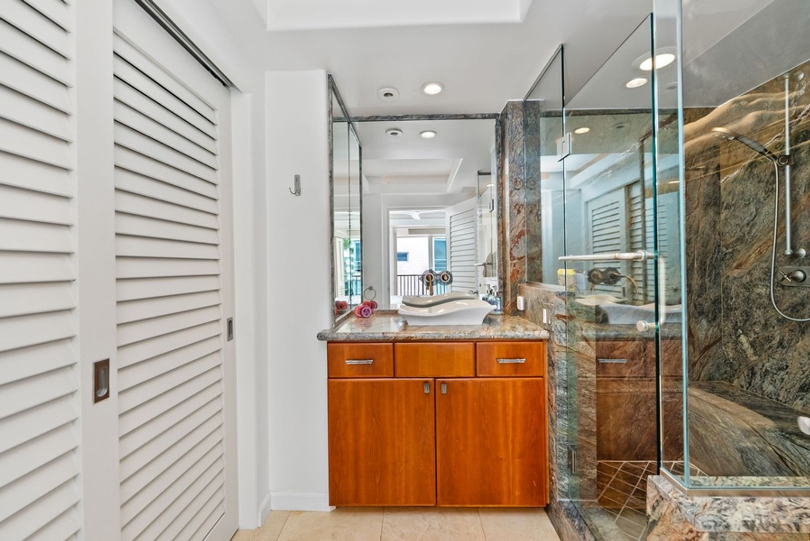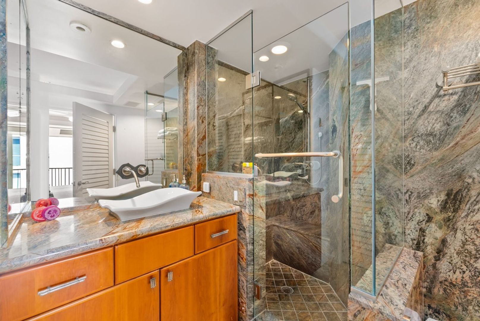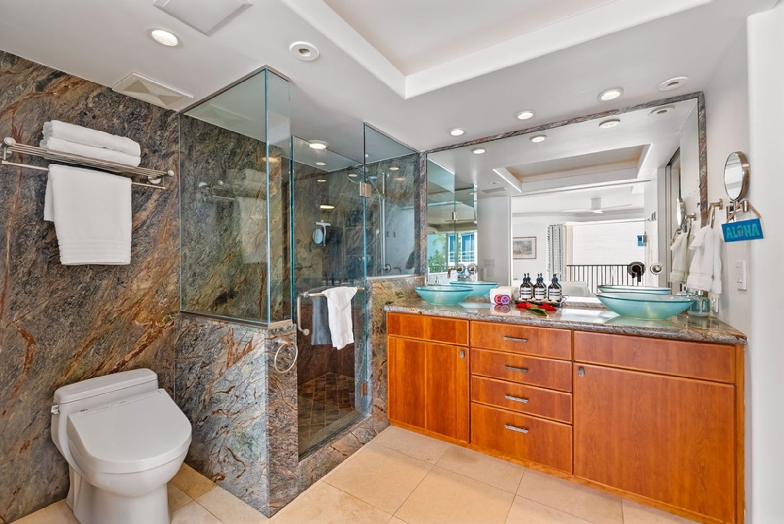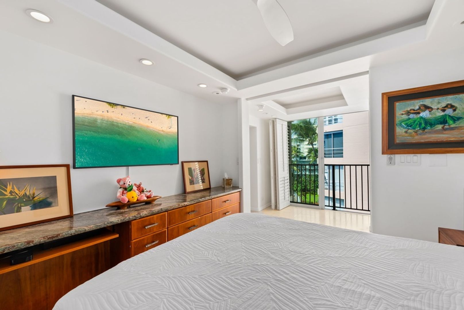 The primary suite features a California King bed and an ensuite bathroom with a walk-in shower. Begin each day with peaceful views and unwind in a setting designed for complete relaxation, equipped with a wall-mounted TV and ceiling fan. The second bedroom includes a comfortable Queen bed, TV, and its own private ensuite bathroom with a walk-in shower, providing additional privacy and convenience. Both bathrooms continue the condo’s sophisticated aesthetic, with granite countertops and high-end fixtures.