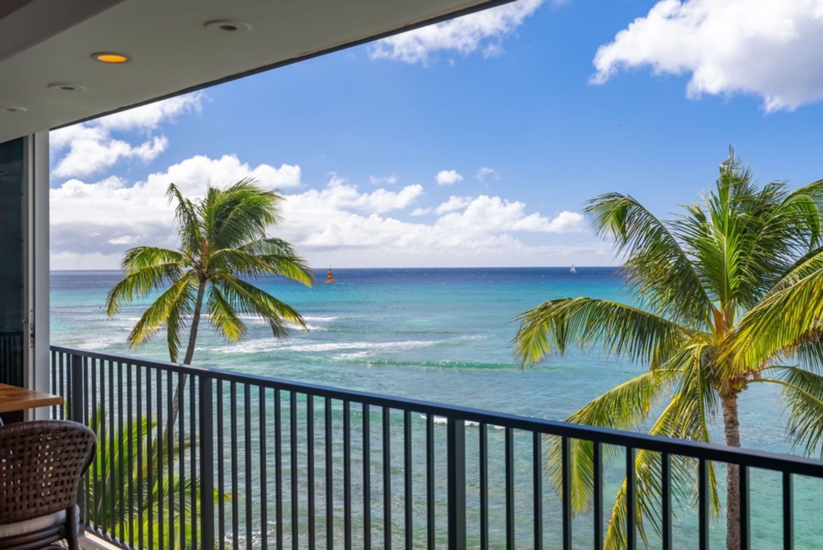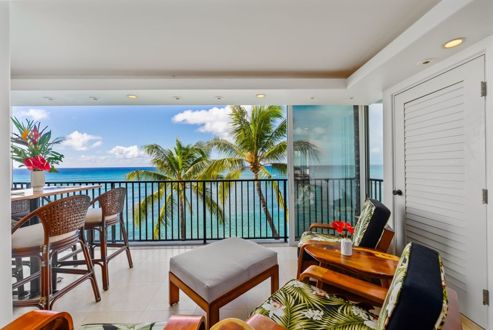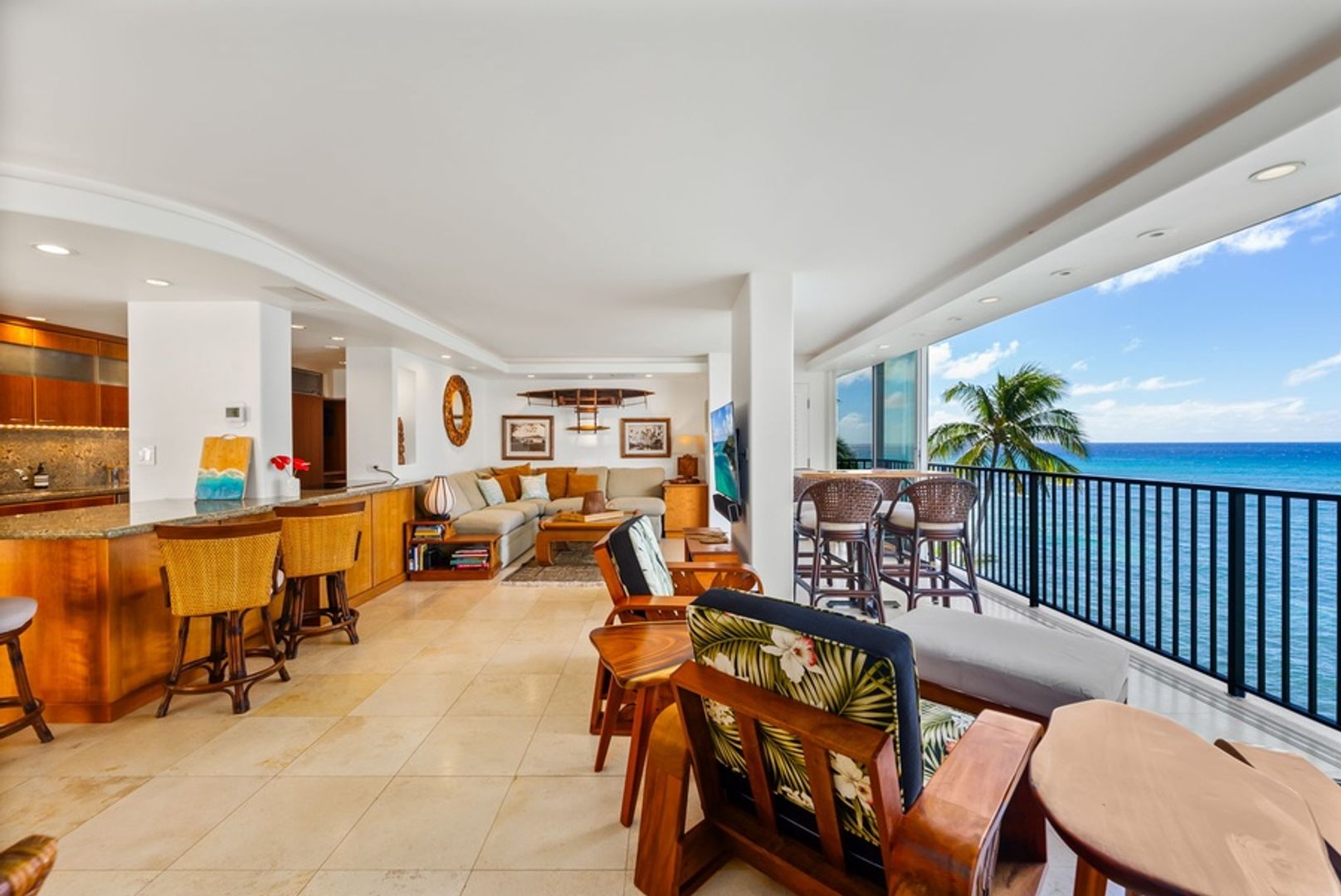 * Unmatched Ocean and Diamond Head Views: Floor-to-ceiling glass doors fill the space with natural light and frame panoramic views of the ocean, with Diamond Head’s majestic silhouette in the background.