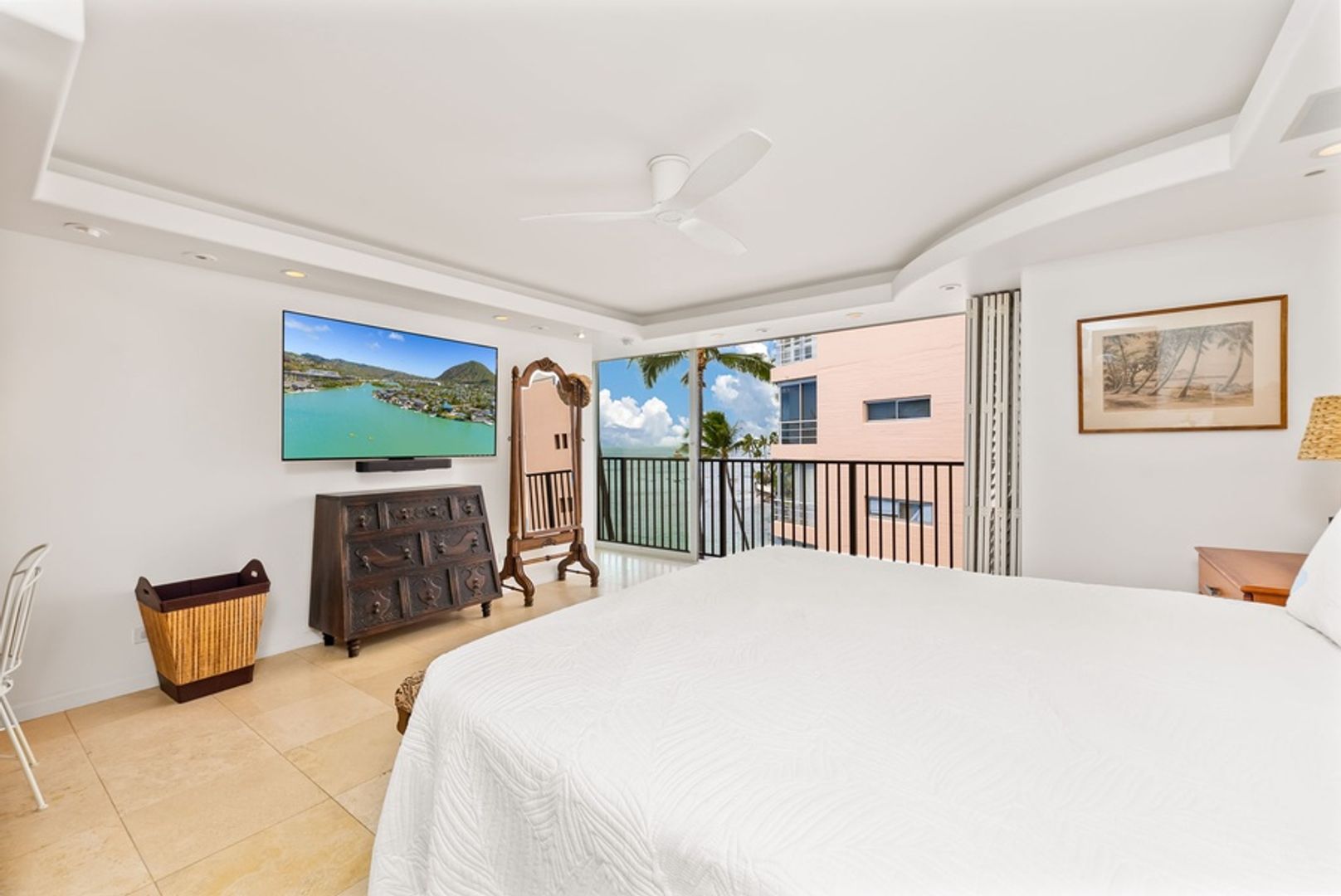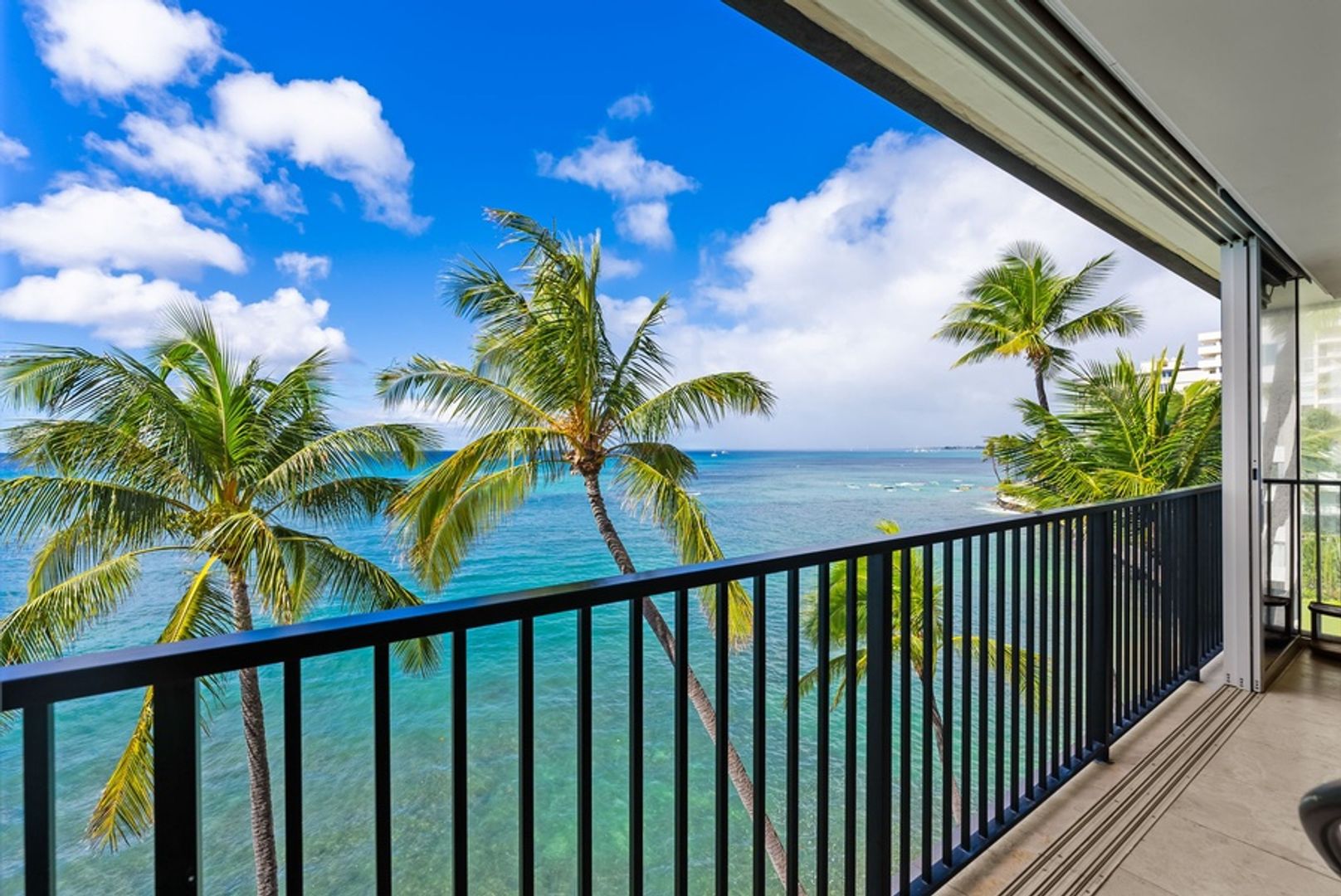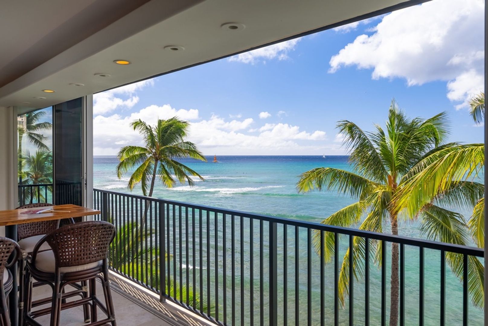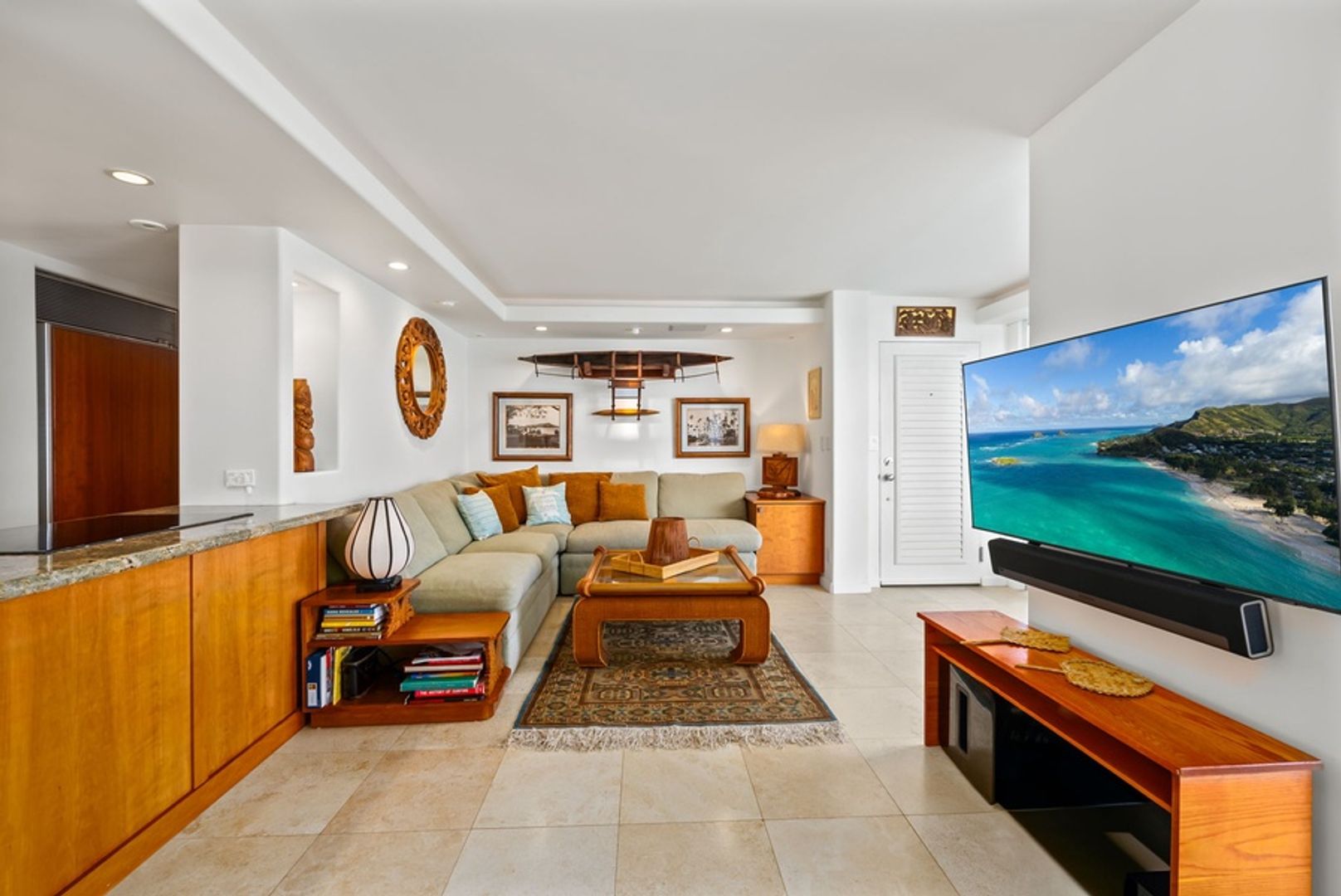 * Unmatched Ocean and Diamond Head Views: Floor-to-ceiling glass doors fill the space with natural light and frame panoramic views of the ocean, with Diamond Head’s majestic silhouette in the background.