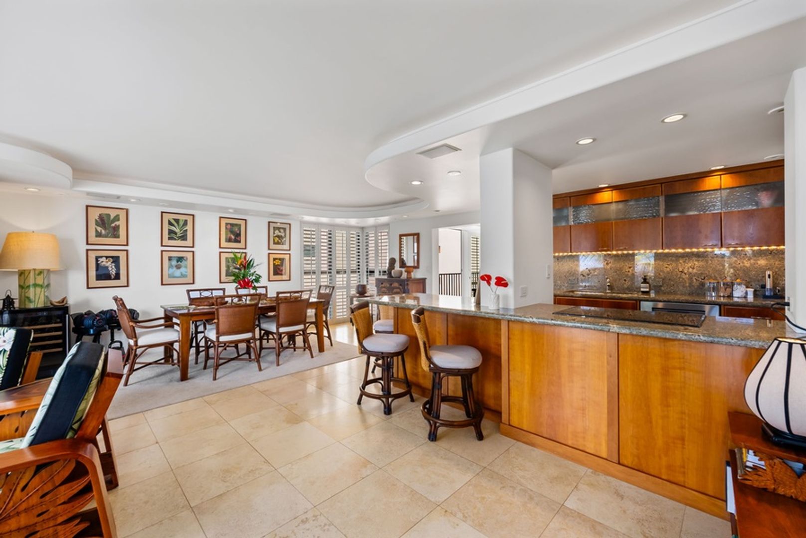 Upon entering Kaimana Views, you’re welcomed by an open-concept living area that showcases expansive ocean views. The living room, furnished with plush seating, is your personal observatory for mesmerizing sunsets and even occasional whale sightings. The adjoining dining space offers an ideal spot for shared meals, with Waikiki’s skyline and serene ocean vistas as your backdrop.
